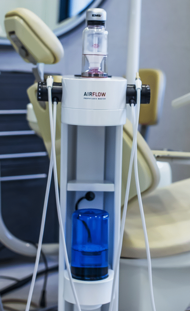 Aparelho que promove uma limpeza confortável e indolor, pó ultra fino, água aquecida e uma eficiente profilaxia.
